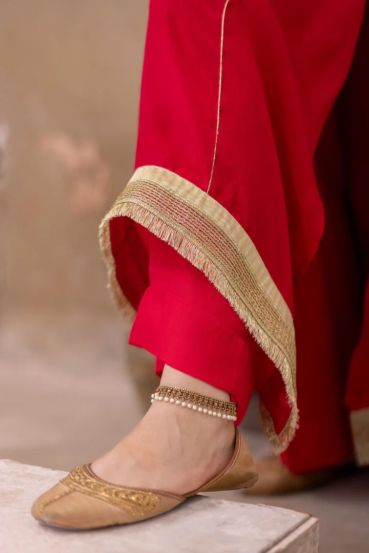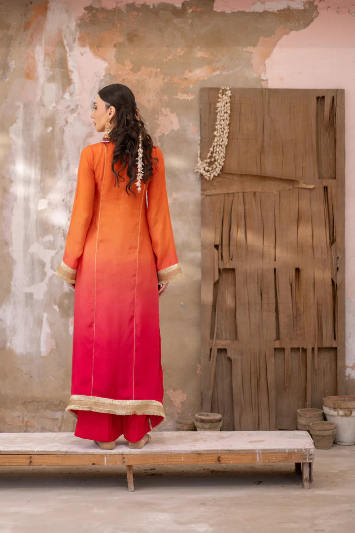 A delicious pink & orange ombrè outfit, carefully hand-dyed to achieve this sublime ombrè effect. Adorned with intricate gold details, this ensemble is a masterful balance of relaxed elegance and vibrant charm, perfect for this Eid.