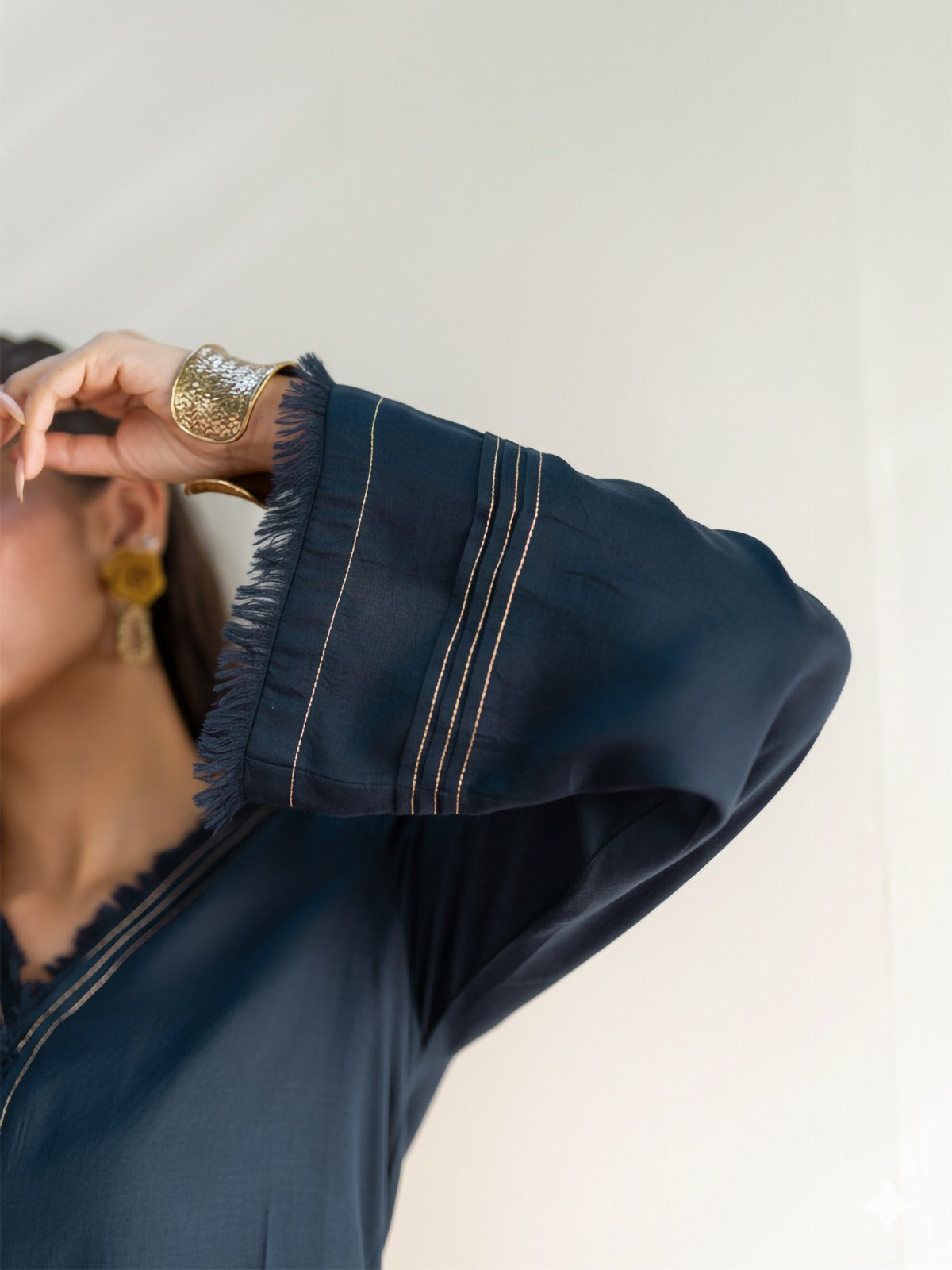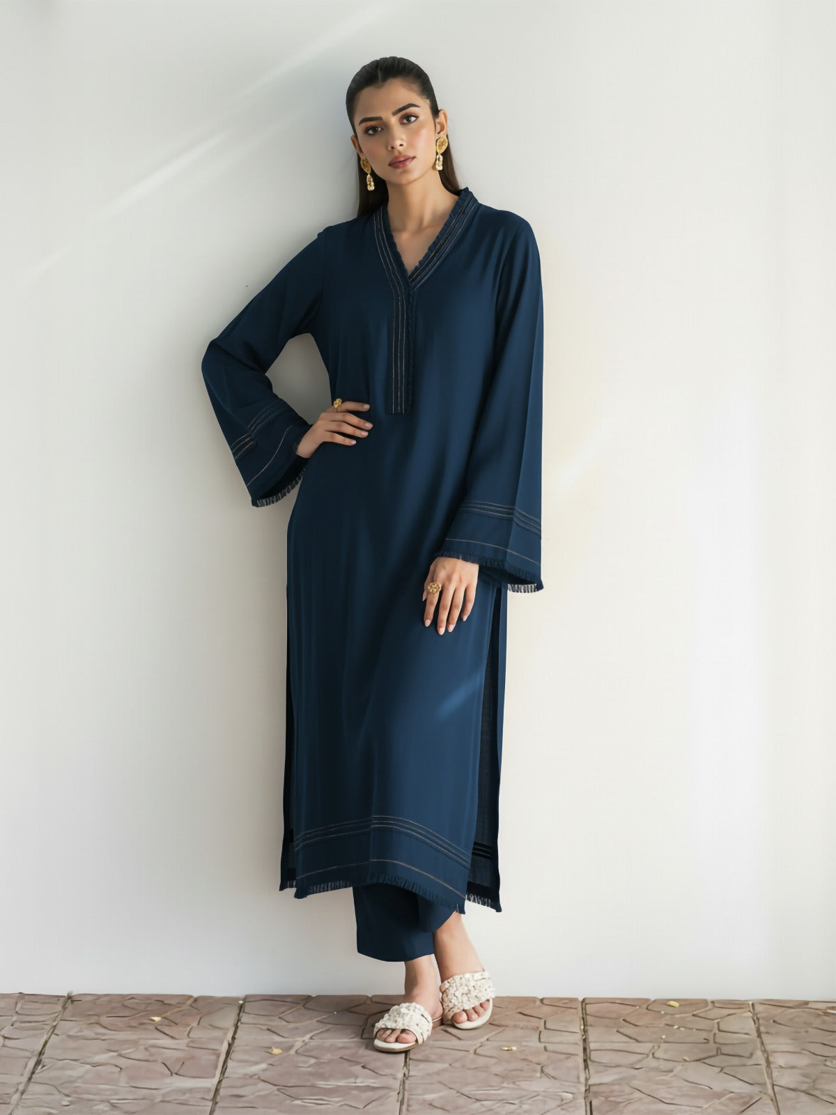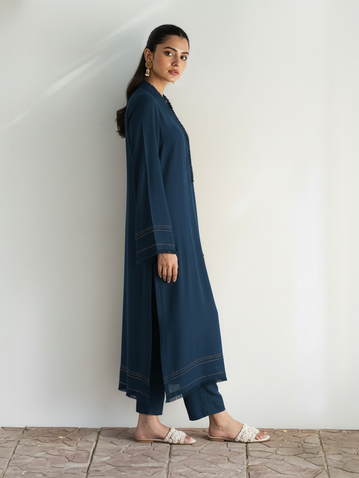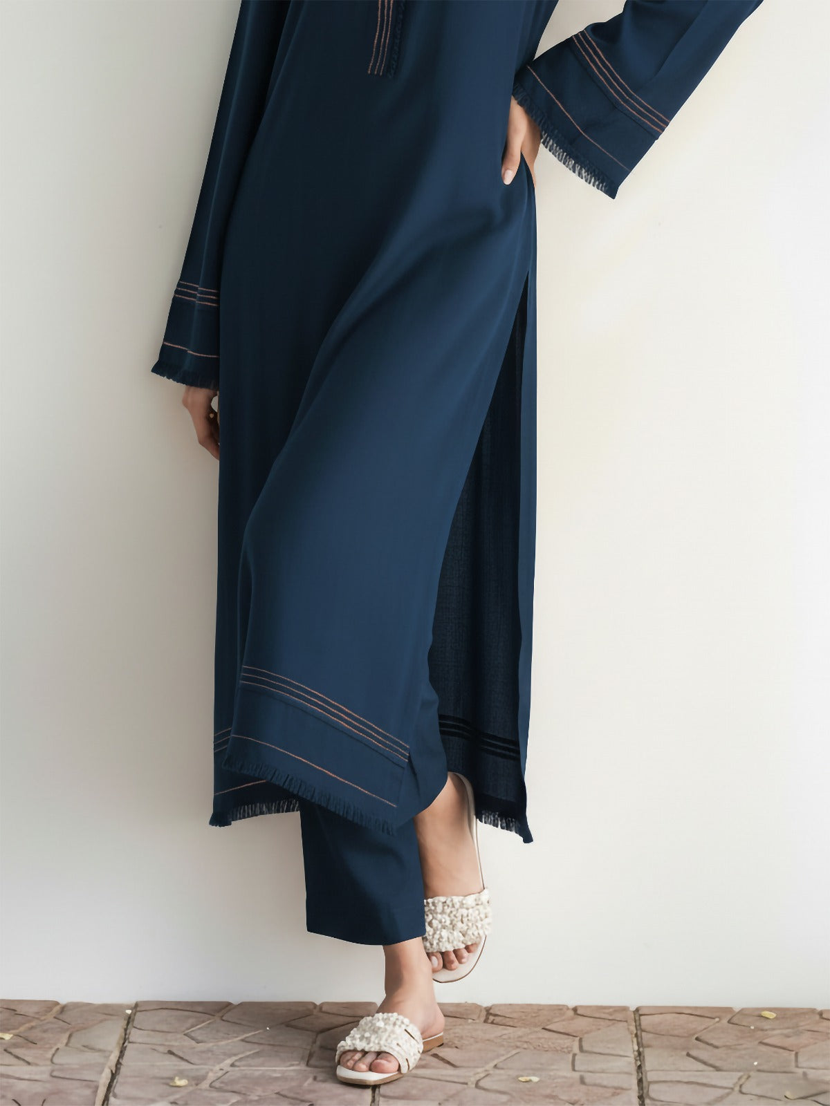 The Mirha Set: A stunning 2-piece set, featuring a long flowy shirt and slim pants. Perfect for cozy morning brunches, and chilly winter evenings, the outfit features zari thread, fringes, and other intricate details. Draped in deep navy hues, this ensemble is the ultimate winter fit.