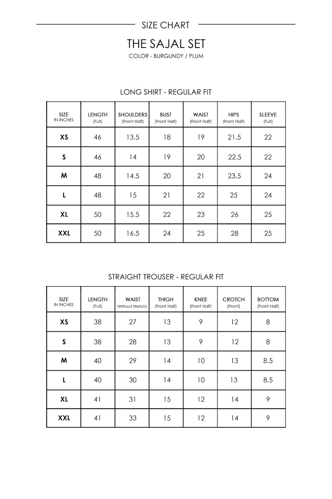 The Sajal Set: A stunning 2-piece set, featuring a long flowy shirt and slim pants. Perfect for cozy morning brunches, and chilly winter evenings, the outfit features zari thread, fringes, and other intricate details. Draped in deep burgundy and plum hues, this ensemble is the ultimate winter fit.